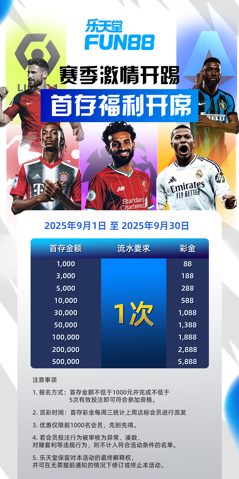 ➊新客户首存送金,1千送88元,3千送188元,类推如下图,完成1倍流水次周3自动到账,1倍水提。